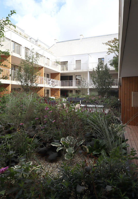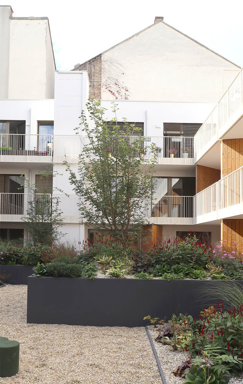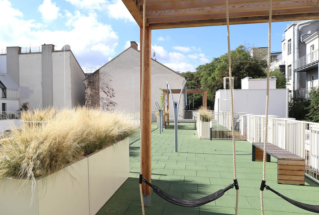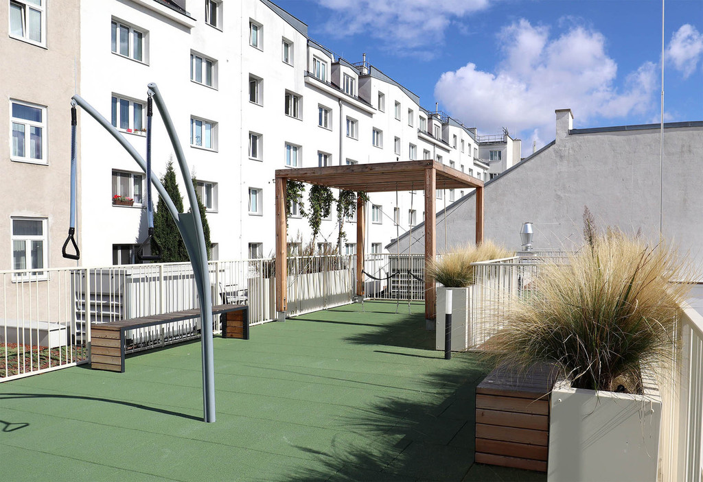 Der ruhige Atriumhof bildet die Grüne Mitte des Wohnbaus im dicht verbauten 7. Wiener Gemeindebezirk. Ein Rahmen aus höhengestaffelten Pflanztrögen mit Blühstauden und mehrstämmigen Hopfenbuchen und Feldahorn bildet einen Grünpuffer zu den Privatterrassen. Spiel- und Sitzhocker verteilen sich locker in der bespielbaren Rieselfläche. Die gemeinschaftliche Fitnessterrasse bietet Raum für Bewegung und Gymnastik mit Fitnessgeräten und multifunktionalen, begrünten Pergolen.