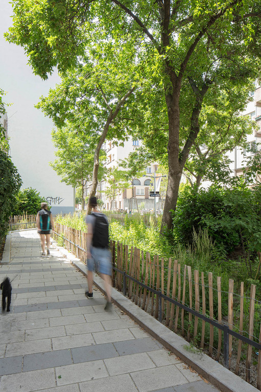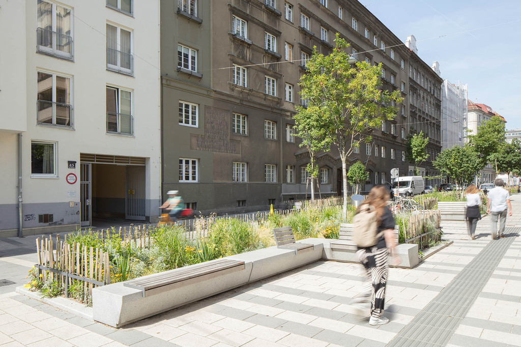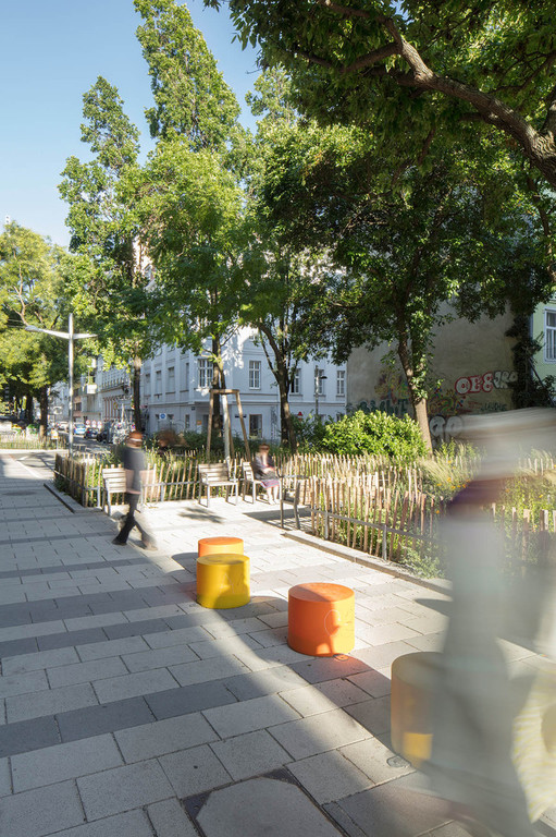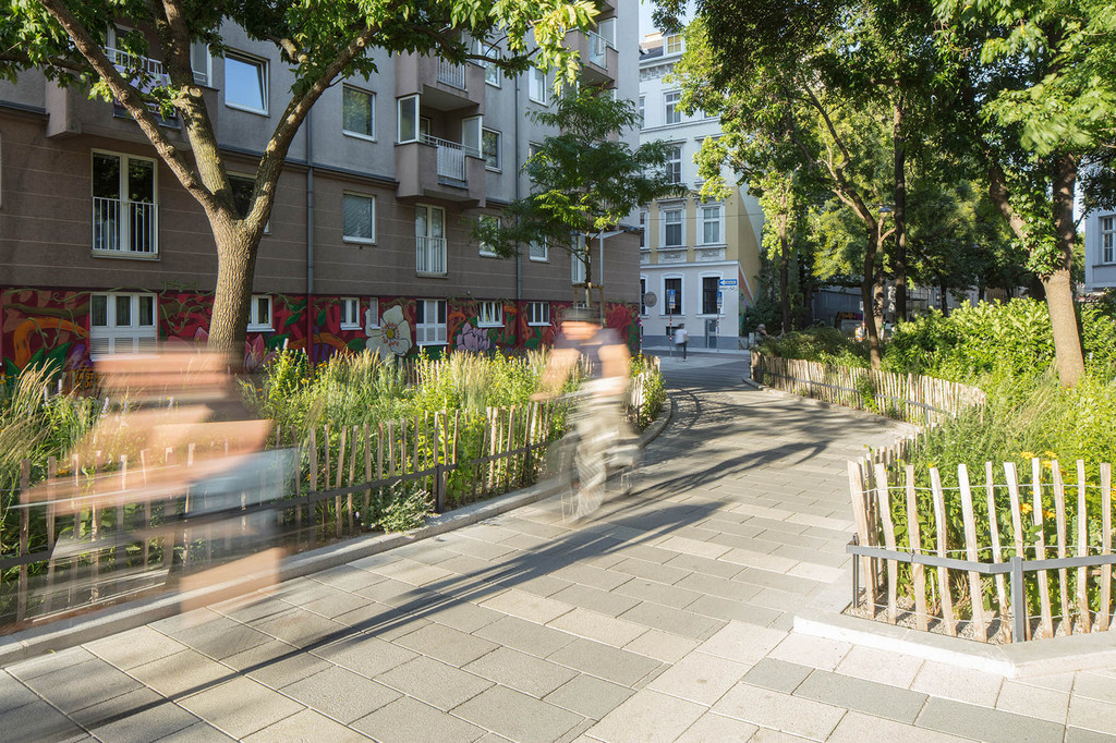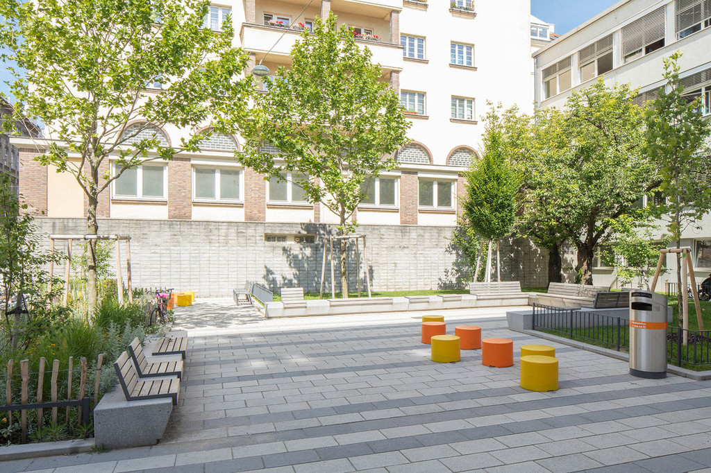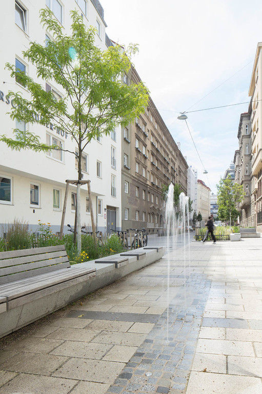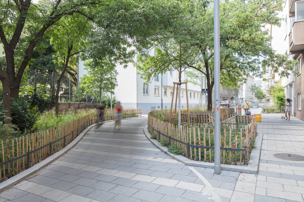 Die umfassende Umgestaltung des Schulvorplatzes und des Straßenraums in der Pfeilgasse wurde durch die Entfernung der Parkplätze ermöglicht. Die Neustrukturierung der Erschließung entflechtet den Hauptradweg von den Zugangs- und Aufenthaltsbereichen und erhöht damit die Sicherheit für die Schulkinder. Großzügige Staudenbeete fungieren als Grünpuffer und generieren attraktive Teilräume mit Sitznischen und wegebegleitenden Sitz- und Spielhockern. Die charakteristischen Belagsbänder erzeugen einen Strichcode, der den linearen Raum optisch verbreitert. Der inverse Farbwechsel vom Radweg zum Gehweg erleichtert die Orientierung und erhöht den Wiedererkennungswert. Schwammkörper im Untergrund speichern das Niederschlagswasser und den Abfluss des kühlenden Wasserspiels für die zahlreichen Baumpflanzungen.