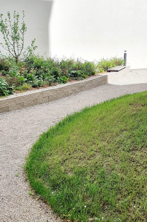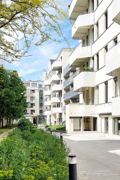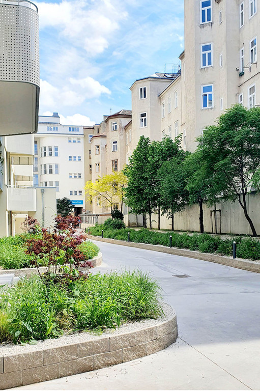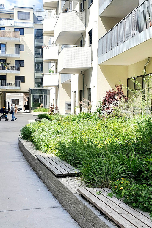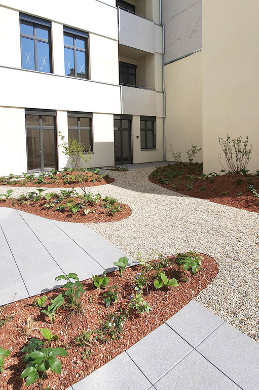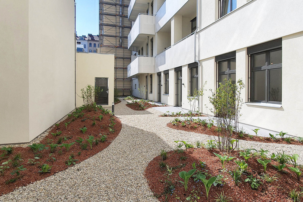 Die Transformation der ehemaligen Strickfabrik zur attraktiven Wohnhausanlage spiegelt sich im Freiraum wieder. Die monofunktionalen und geradlinigen Erschließungsräume des postindustriellen Standortes verwandeln sich zu atmosphärischen Erlebnisräumen mit hoher Aufenthaltsqualität. In Anlehnung an die weichen Strukturen der Strickwaren, die früher hier produziert wurden, gliedern nun Grünflächen in organischen und fließenden Formensprachen den Freiraum.